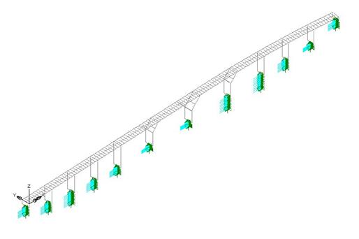 교량의 교좌장치를 제외한 다른 재료특성은 선형 탄성 재료로 가정되었으며 교좌장치는 종방향과 횡방향에 대하여 각각 탄소성 재료(Elasto-plastic)로 모델링 되었다. 교좌장치의 비선형 거동을 파악하고, 또한 각 교량의 모드 형상이 조화된 전체 거동을 얻어내고자 시간이력동해석을 수행하였다. 교량의 경계조건은 유동성을 가지는 연암지지 파일로 이상화되었다.