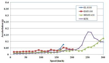 교량상판의 속도별 수직가속도 (g)