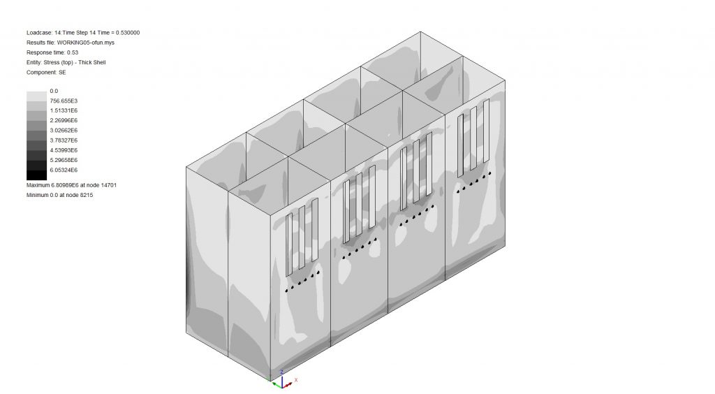 - 유체의 동수압에 대한 부가질량 – 동수압이 작용하는 횡격벽과 종격벽상의 각 절점에 부가된 유체질량의 크기를 절점의 높이에 따라 적용, 유체부가질량을 나타내는 절점에 재료특성적용