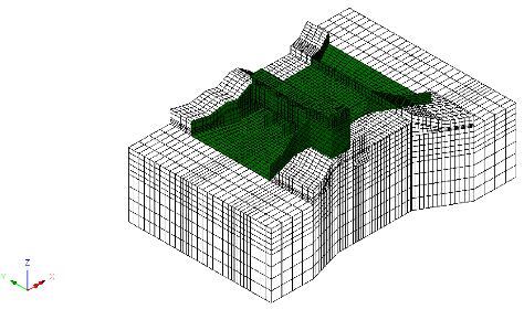 - 지반은 3차원 입체요소 (HX8M), 지반의 무한경계를 표현하기 위해 3차원 조인트 요소(JNT4, Joint properties general)를 사용한 경계조건을 구성