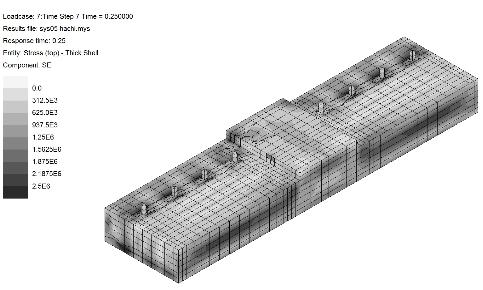 - 뚝도 정수센터 오존접촉조 구조에 대하여 유체 및 지반과의 상호작용을 포함하여 지진에 대한 구조 안정성을 검토하였다. 지진은 설계스펙트럼이나 시간이력 가속도의 형태로 적용할 수 있는데, 본 해석에서는 제공된 시간이력가속도를 기반암 하면에 적용시켜 해석을 수행하였다. 지진파는 3가지 적용방향을 모두 고려하였으며, 각 방향별 지진파에 대한 영향을 조합한 결과로부터 얻어진 최대응력과 절대 최대변위에 대하여 허용기준을 만족하는지 검토하였다.