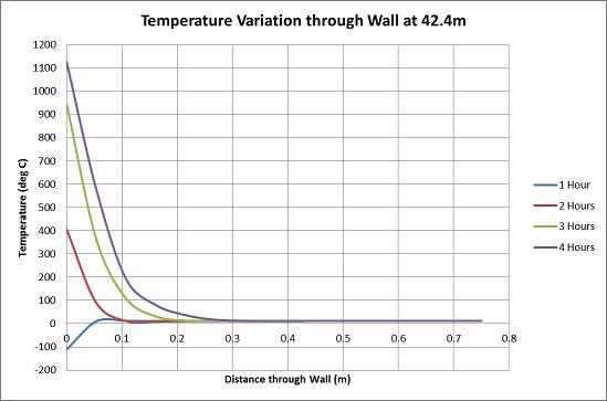 시간에 따른 벽체 단면 깊이별 온도 분포 (바닥면으로 부터 42.4m 높이)