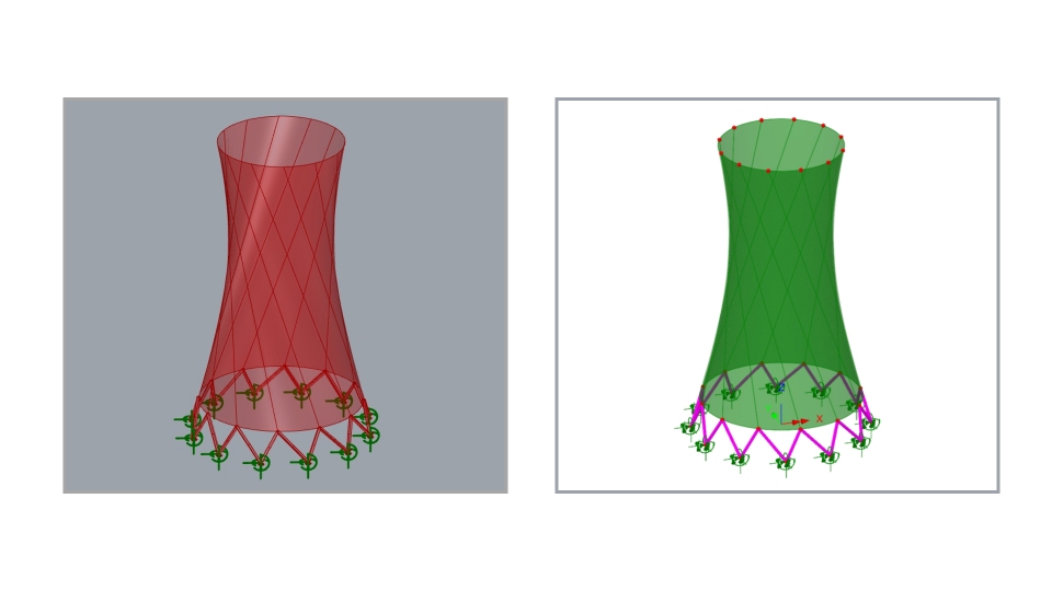 Grasshopper에서 실행하면 변수 입력만으로 Cooling tower 에 대한 LUSAS 구조해석 모델을 생성합니다.