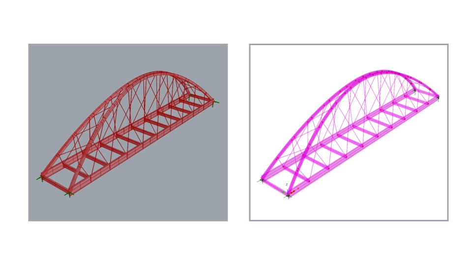 Grasshopper에서 실행하면 변수 입력만으로 Network tied-arch bridge 에 대한 LUSAS 구조해석 모델을 생성합니다.