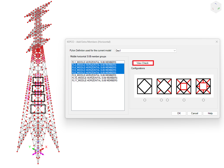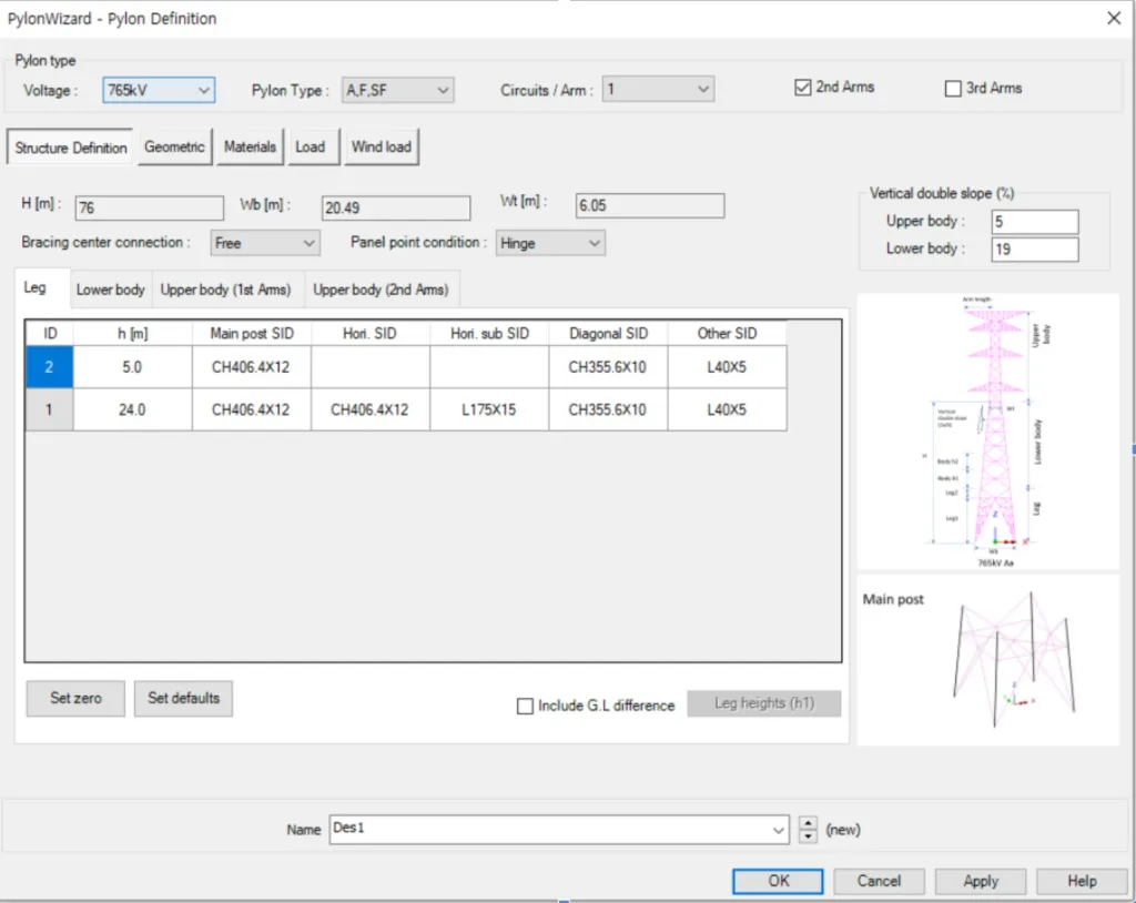 입력한 제원에 따라 송전철탑에 대한 구조해석 모델을 생성합니다.