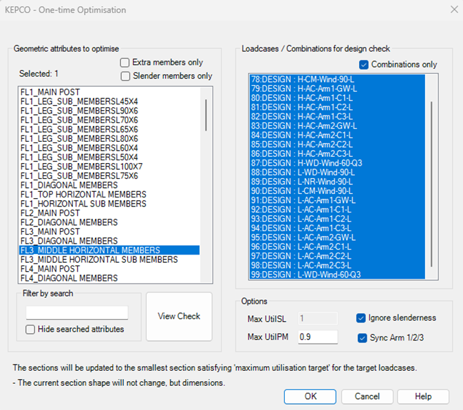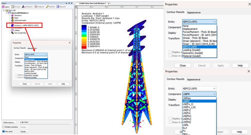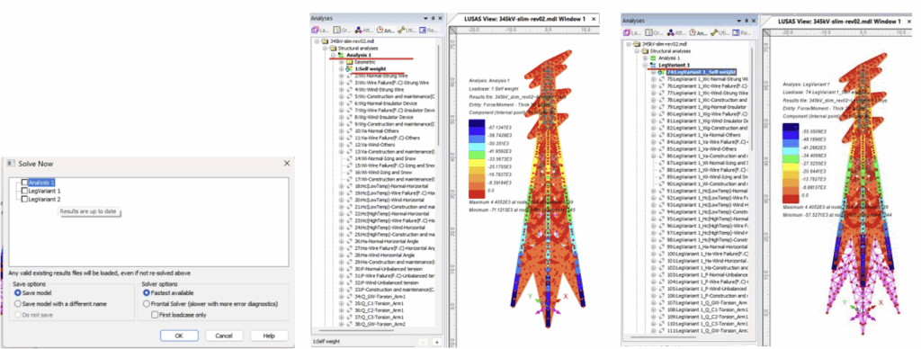 단면 최적화 (설계 최적화)를 수행하면, 각 개별 철탑에 대해 설계 검토가 수행되며, 아울러 여러 철탑이 공유하는 상부의 부재에 대해서는, 철탑 각각에 대한 검토 결과를 모두 만족하는 단면이 선정되도록 합니다.