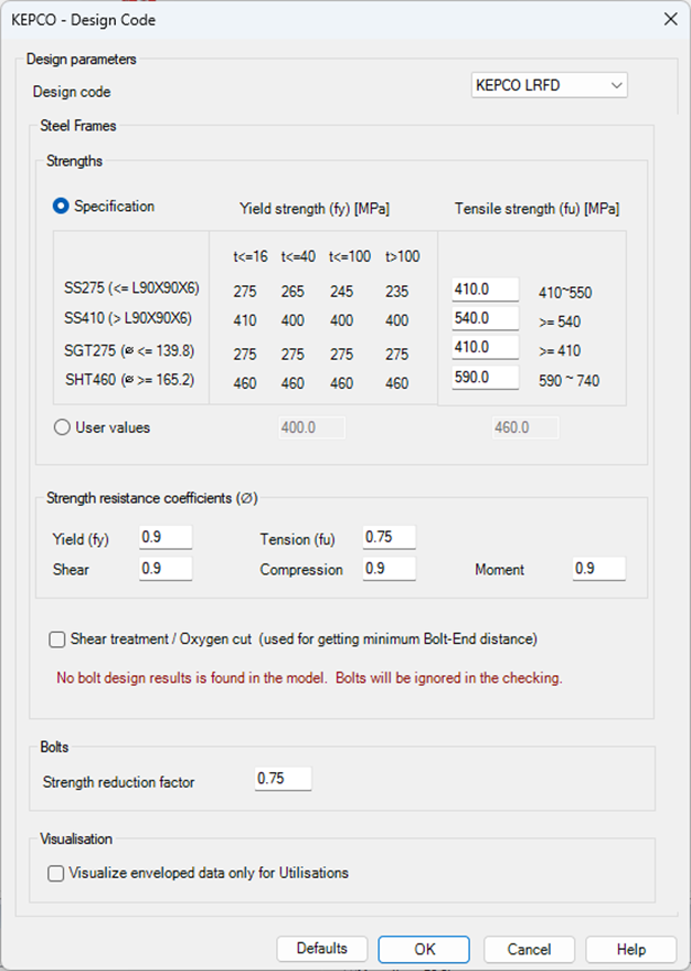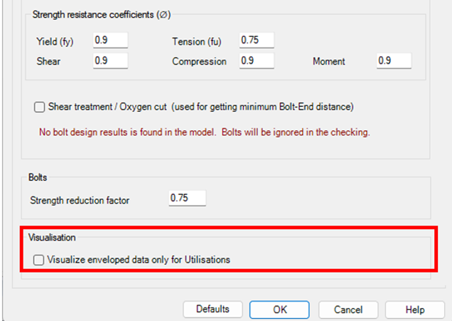 설계기준 설정에서 ‘Visualize enveloped data only for Utilisations’ 를 선택하면, 모델러에 정의된 모든 하중조합에 대한 설계검토 결과를 비교한 후, 각 부재별로 최대값을 표시합니다.