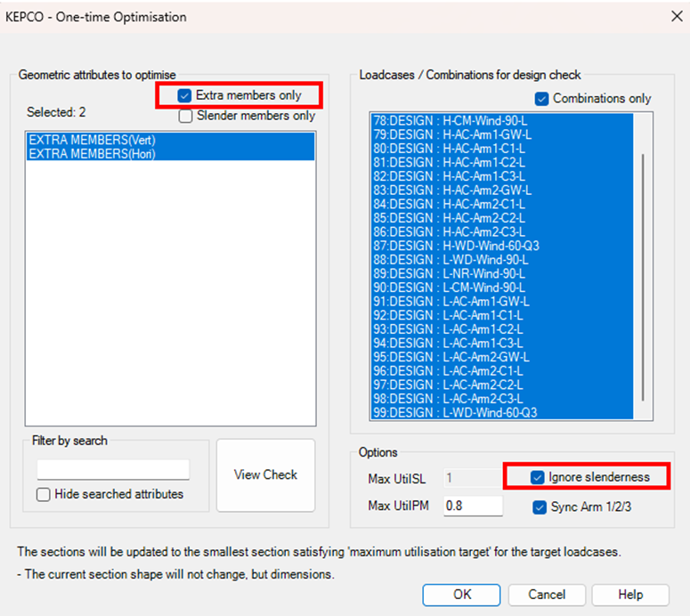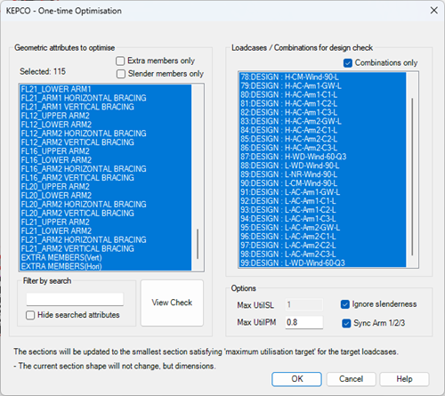 보조재는 보조재 추가에 따른 구조해석의 대상으로 보지 않고, 모 부재에서 발생하는 단면력의 1~2% 을 지지할 수 있는 단면으로 결정합니다. 보조재를 생성할 때, 선택 가능한 단면 데이터베이스 중 가장 작은 단면을 배치한 상태이므로, 이 기준을 충족하기 위해 One-time Optimisation 을 보조재를 대상으로 실행합니다.