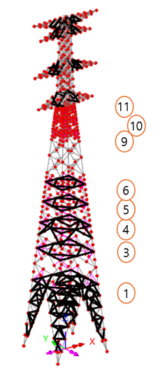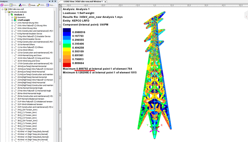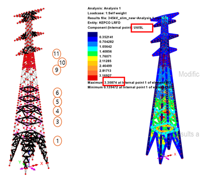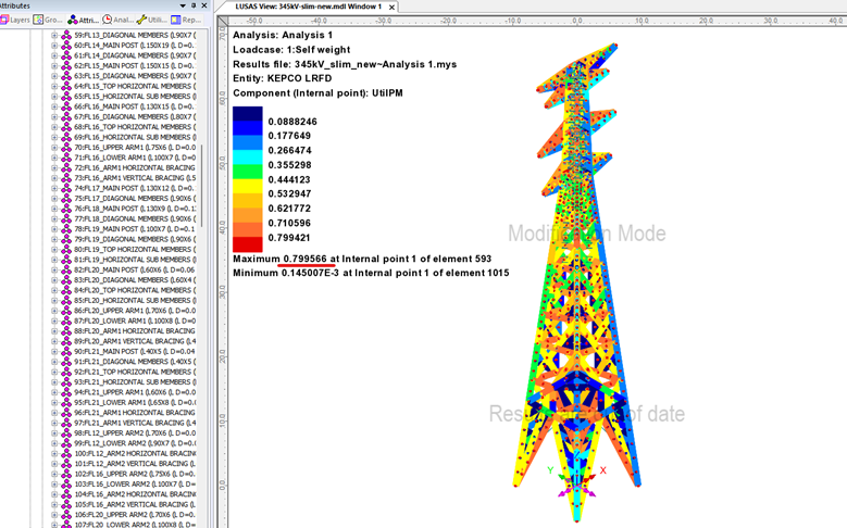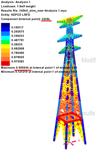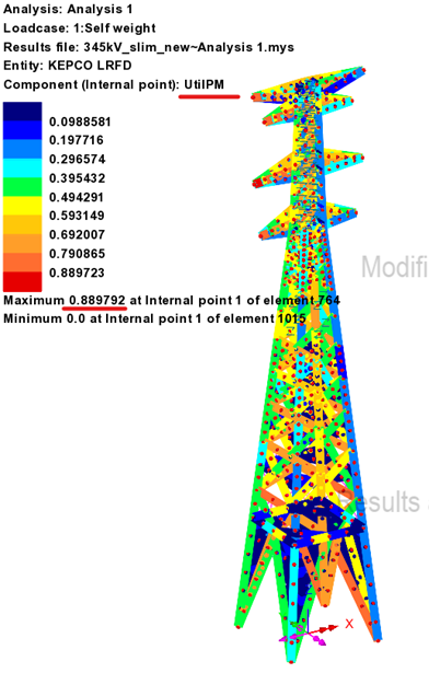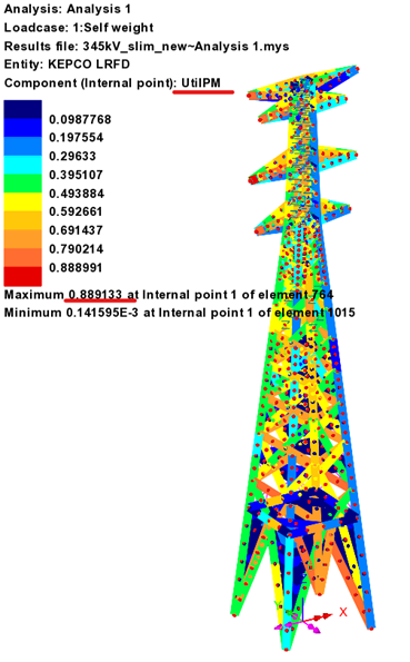 부재 단면이 변경된 상태인 모델을 대상으로 해석을 다시 수행하면, 풍하중과 단면변화에 따른 응력재분배가 반영된 최종 검토 결과를 확인할 수 있으며, 아래 그림과 같이 UtilPM = 0.89 으로 확인됩니다.