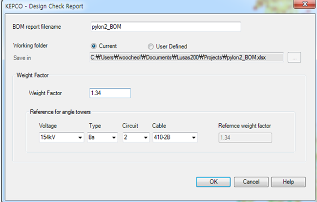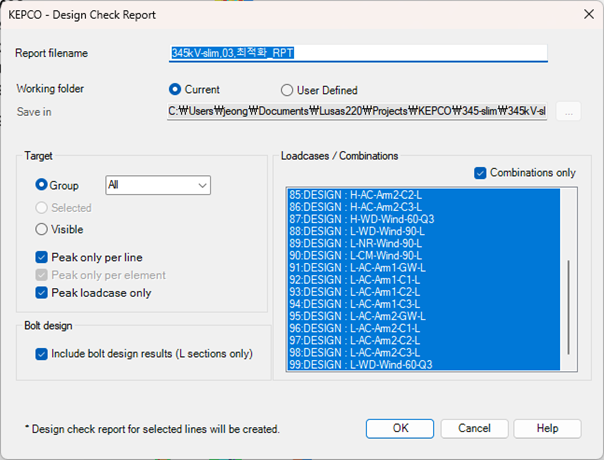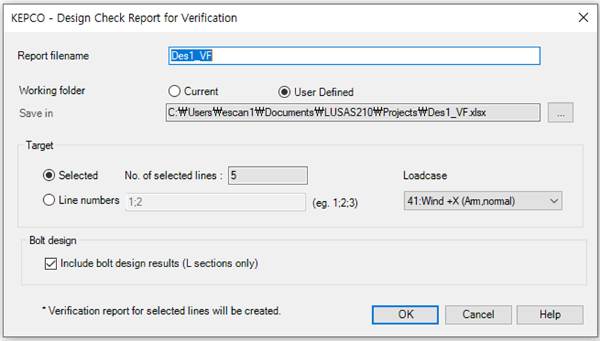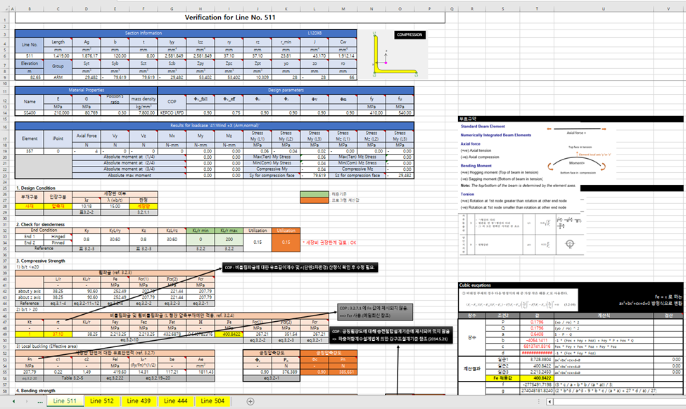 설계검토 과정과 결과를 검증하고자 하는 부재 (Line)들을 선택하거나, Line 번호를 지정하여, 부재의 제원, 발생 단면력, 설계검토 과정을 정리한 Excel 파일을 출력합니다.