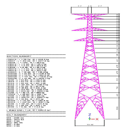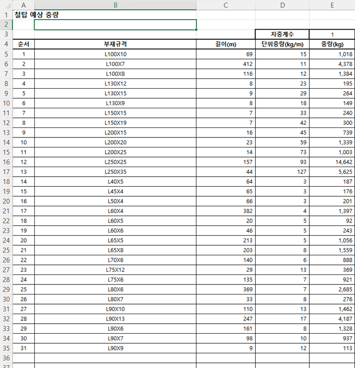 각 부재에 사용된 단면 형상 종류별로 총 길이와 중량을 정리합니다.