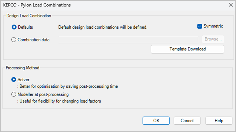 기본값으로 ‘Defaults를 선택하고 ‘OK 를 누르면, 현재 생성된 철탑의 형상에 필요한 하중조합을 생성하게 됩니다. Arm의 형상이 대칭인 경우 Symmetric 옵션을 체크하여 생성하는 중복되는 하중조합을 제외할 수 있습니다.