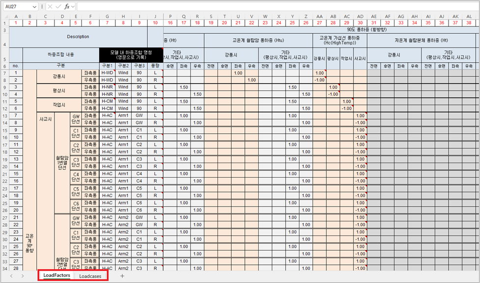 하중조합 정의를 위한 엑셀 스프레드시트 템플릿은 아래와 같이 ‘LoadFactors’와 ‘LoadCases’ 두 개의 시트로 구성되어 있습니다.
