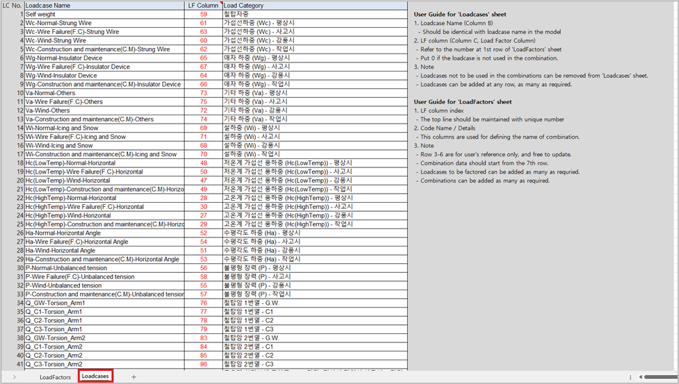 템플릿을 다운로드 할 때, ‘Loadcase’ 시트의 ‘Loadcase Name’ 열이 현재 모델에 정의된 하중케이스명으로 업데이트 됩니다. 사용자는 ‘Loadcase’ 시트의 ‘LF Column’ 열의 숫자와 일치하는 값을 ‘LoadFactors’ 시트에서 상단 첫 번째 행에서 확인하고, 해당 위치의 하중이 ‘Loadcase Name’과 일치하는지 점검합니다. ‘LoadFactors’ 시트에서 하중조합에 적용할 하중계수를 정의합니다.
