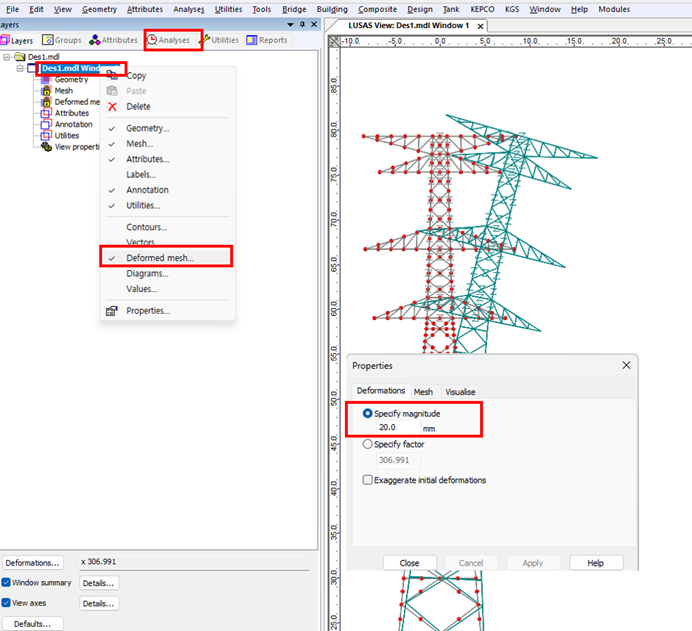 Treeview의 Layer탭에서 파일명 마우스 우측을 클릭 후, ‘Deformed mesh’를 선택합니다. ‘Specify magnitude’에 최대 변위를 지정합니다.
