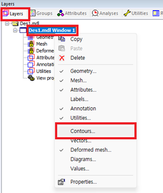 Treeview> Layers 탭에서 모델파일명 마우스 우측 클릭 후, ‘Contours’ 메뉴를 선택합니다. 부재의 축력을 확인하기 위해 ‘Entity’에서 ‘Force/Moment – Thick 3D Beam’을 선택하고 ‘Component’는 ‘Fx’를 선택합니다.