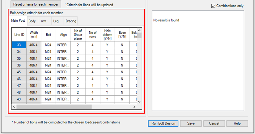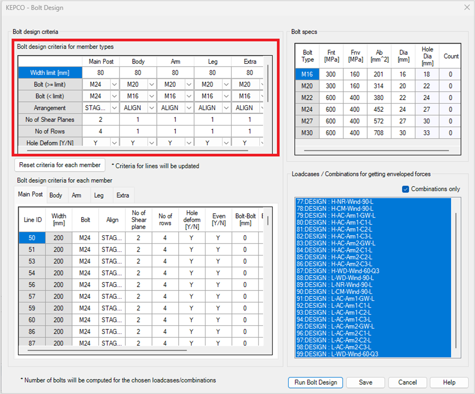 Main Post, Body, Arm, Leg, Bracing 그룹별로 볼트설계에 필요한 기준을 정의합니다. 부재의 폭을 기준으로 사용할 볼트의 종류를 지정할 수 있습니다. 배치기준 (정렬배치 혹은 엇모배치)와 함께 연단거리, 측단거리 등을 지정할 수 있으며, ‘0’을 입력하는 경우 설계기준에서 정하는 최소값으로 가정하여 적용됩니다.