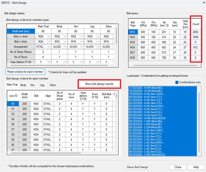 소요 볼트 개수 계산이 완료되면, ‘Bolt spec’에 볼트 종류별로 계산된 수량이 업데이트 되고, ‘Show bolt design results’ 버튼이 대화창에 추가로 표시됩니다.