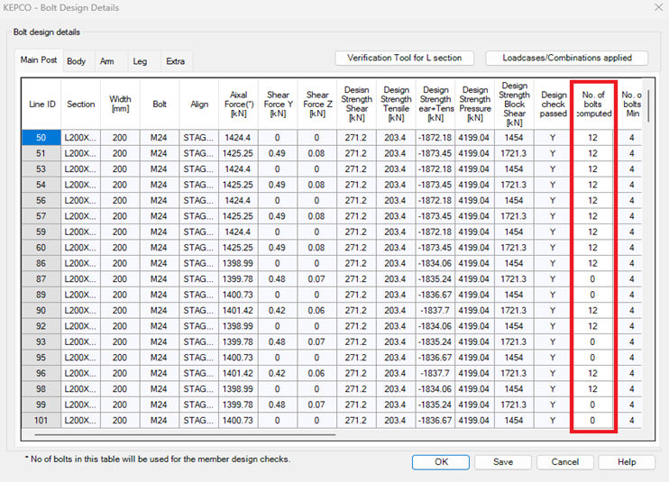 계산된 각 부재 별 ‘No of bolts computed’를 임의로 지정할 필요가 있는 경우에는 현재 대화창에서 값을 수정한 후 ‘Save’ 버튼을 눌러 저장하며, 이에 따라, 각 볼트 별 총 수량도 업데이트 됩니다.