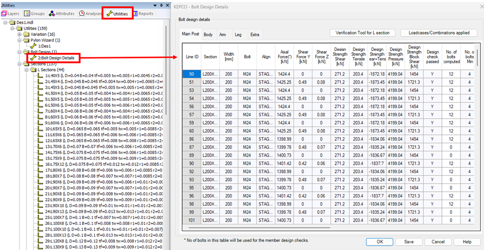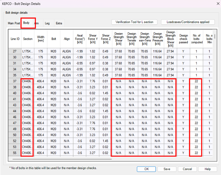 표시된 단면력은 지정한 하중케이스 또는 하중조합의 해석결과로부터 얻어진 결과를 사용하되, 해당 부재에서 발생한 단면력 대신 철탑 중앙 연직선을 기준으로 전후/좌우 대칭되는 위치에 있는 다른 부재들의 결과값들을 비교하여 얻은 최대값을 의미하며, 이 값으로 소요볼트 수량을 계산합니다.