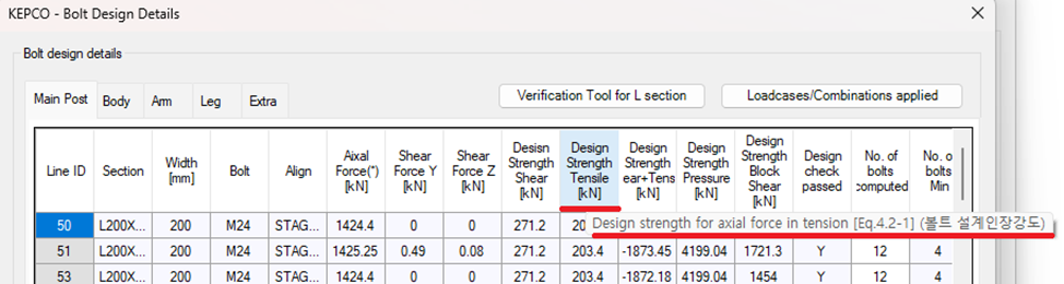 CHS(강관)에 대한 검증은 ‘Show bolt design results’에 표시된 값으로 쉽게 검증할 수 있으므로, 검증용 도구는 L 형강에 대해서만 활용할 수 있습니다.