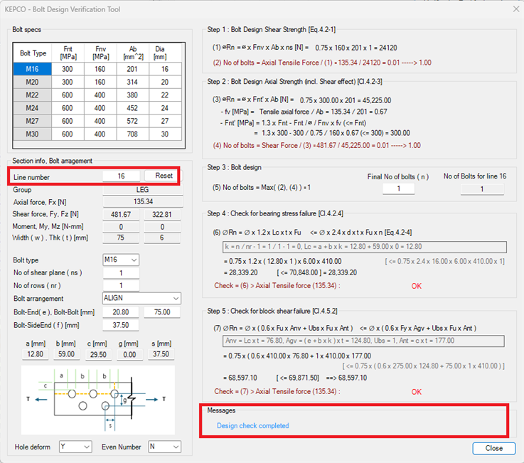 L 형강에 대한 소요 볼트 계산과정을 검증할 수 있는 대화창이 표시됩니다. ‘Line Number’를 지정하고, ‘Update’ 버튼을 누르면, 해당 부재번호에 대한 해석결과와 볼트설계 기준으로 각 입력값이 업데이트 되며, 이에 따라 소요 볼트 개수 산정 과정을 검토할 수 있습니다.