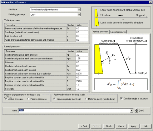 - 트리리니어(능동/수동) 지반 압력 조인트 재료 마법사를 사용하여 다양한 토지-구조 상호작용 문제를 모델링하는 것을 단순화합니다. 깊이에 따라 변화하는 속성을 가진 구간 선형 조인트 재료 속성을 생성합니다. 물의 존재로 인한 특성 변화 또는 지반의 층을 나타내기 위해 여러 속성을 정의합니다.