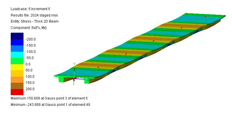 세트에서의 모든 세그먼트를 시공하여 정렬하고 조인트 처리한 후, 일반적으로 수직으로 포스트 텐셔닝하여 완전한 경간을 만드는 과정을 말합니다. LUSAS에서는 이를 선형 보 모델로 모델링할 수 있으며, 결과 윤곽을 표시하기 위해 데크 단면의 선택적 표면 처리를 할 수 있습니다.