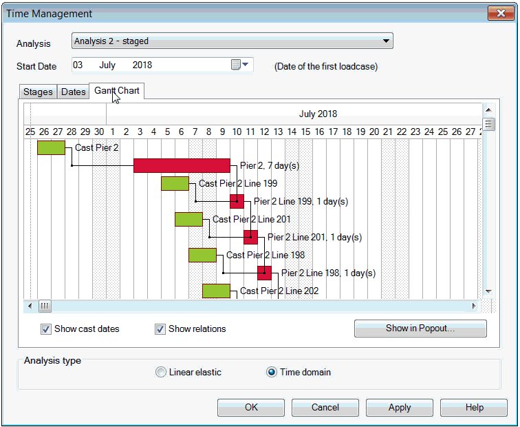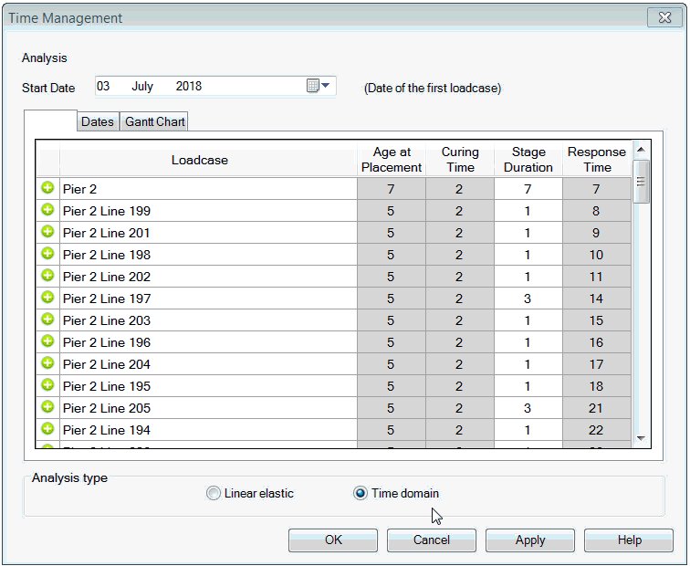 시간 관리 기능을 사용하여 간단한 시공 일정을 관리하고, 단계적 시공 분석에서 사전 정의된 시공 단계의 기간을 쉽게 조정합니다. 비선형 및 비상태 제어에서 이전에 지정된 하중 케이스의 총 응답 시간 값을 쉽게 자동으로 업데이트할 수 있습니다.