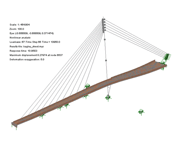 디트로이트의 멕시칸타운 배글리 거리 보행자 교량은 미시간 주에 건설된 최초의 케이블 지지 교량입니다. 이 교량은 미시간 교통부를 위해 HNTB가 설계하였으며, URS Corporation은 시공 검사 엔지니어로 임명되었습니다. 고유한 하중 해석, 시공 해석 및 모든 시공 단계를 설명하는 자세한 시공 매뉴얼은 Genesis Structures라는 전문 시공 해석 컨설턴트에 의해 Walter Toebe Construction의 클라이언트를 위해 수행되었으며, LUSAS Bridge 해석 소프트웨어를 사용하였습니다.