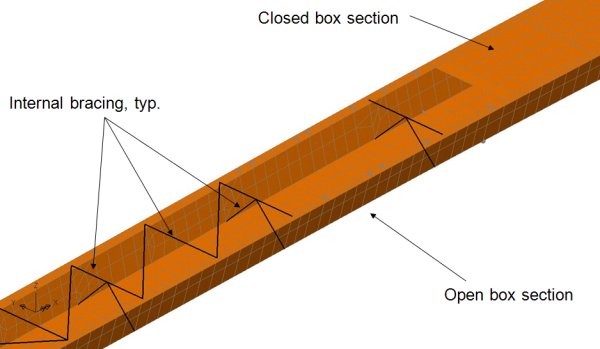 상부 구조의 강판, 보강재, 복합 콘크리트 슬래브 및 콘크리트 배리어는 모두 3D 셸로 모델링되었습니다. 내부 거더 브레이싱은 빔 요소로 모델링되었습니다. 콘크리트 슬래브에 대한 시간 의존성(크리프 및 수축) 효과도 포함되었습니다. 콘크리트 Deck의 타설 작업은 초기 보의 회전을 허용하기 위해 임시 지지대가 사용될 필요가 있었습니다. 이후, 일체형 교각 연결이 이루어진 후, 모델된 지지대가 그에 맞게 업데이트되었습니다. 박스 거더 시스템에 대한 불균일 케이블 하중은 교각의 위쪽, 아래쪽 및 측면 지지를 통해 저항됩니다. 이는 텐션 링크와 파일론 지지 스트럿에서의 수직 및 측면 지지로 보완됩니다. 서쪽 스팬을 지지하는 세 개의 가설 타워는 케이블 텐션으로 인한 리프트 오프 거동의 정확한 모델링을 허용하는 압축 전용 지지대로 모델링되었습니다.
