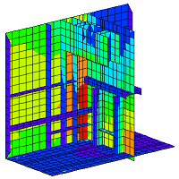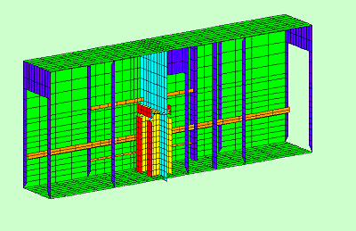 LUSAS Bridge를 사용한 선형탄성해석은 이것을 뒷받침하였고, 물질적, 기하학적으로 상세한 비선형 해석이 극단의 한계 상태에서 격벽부의 완정성을 입증하기 위해 수행되었다. 격벽부와 구조물의 인근 강판은 4개의 노드 thick shell element로 모델링 되었다. 격벽보강재 용접은 자유도 6으로 탄성력이 있고 완벽하게 가소성이 있는 조인트요소로 모델링 되었다. 탄성력이 있고 가소성이 있고 긴장력을 강화된 특성들이 shell 요소로 지정되었다. 조인트 요소들에 대한 항복응력은 특성화되었다.