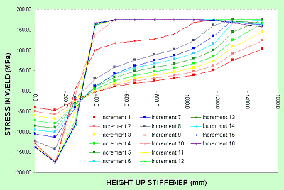 구조물 내에서 항복력의 범위는 plotting yield flags로 표시하여 각각의 하중 증가로 구분하였다. 변형된 mesh의 형태와 연속되는 하중의 증가에 대한 응력콘타 plot의 애니메이션은 격벽자체의 제한된 힘이 접근될 때 어떻게 격벽부에 하중이 재분배되고 있는지를 보여주었다. 조인트요소의 이동은 각각의 하중이 증가되는 경우에 대한 결과물이고, 스프레드 시트는 모든 하중의 증가에 대한 용접라인을 따라서 이동 profile의 플롯그래프에 사용되었다. 이들 그래프는 용접부의 변형이 안전도의 한계로 설정되어 있는 1.0mm의 한계값을 초과하지 않음을 입증하고, 향후 힘든 강화작업이 불필요함을 보여주고 있다. Merrison Report는 많은 사건, 호주의 Westgate 교량과 South Wales의 Milford Haven 을 포함한 1960년대 후반 박스거더의 붕괴로 인한 비극적 재해들 이후에 세워진 Royal Commission의 결과물(보고서)이다.