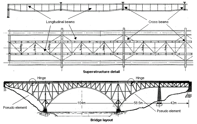 브레이싱된 세로대와 가로보(cross beam)로 구성된 주 아치 트러스 구조물과 상부 구조물 간의 상호작용과 전반적인 변형에 따른 영향을 알아보기 위해 LUSAS를 통해 교량을 3차원으로 모델링 하였다. 또한, 강성을 얻고, 국부적인 영향을 알아보기 위해 LUSAS 프로그램에서 여러 개의 조인트 요소가 모델링 되었다.