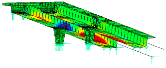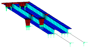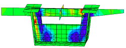 모델링으로부터 탄성 응력 결과를 얻어내어 시방서의 기준과 비교했을 때 사하중과 차량하중의 조합 하에서도 강재 재료에 항복이나 좌굴이 발생하지 않음을 확인하여야 했다. 한 쌍의 박스 모델은 한 박스에만 적용된 활하중이 두 박스에서 어떻게 분배되는지를 알아보기 위해 사용되었으며 두 모델간 격벽 응력 값의 차이가 거의 없음을 알 수 있었다. 그 다음, 응력 결정을 위해 단일 박스 모델이 사용되었다. 격벽은 3차원 솔리드 연속체 부재의 층 위에 지지되었다. 교각에서는 날개벽 형태의 교각을 쉘 요소로 표현하였고 이 쉘 요소가 교량 상판을 지지하며, 교대에서는 여러 포인트에 지점점을 분산시켜 상판을 지지할 수 있도록 하였다. 이로써 이와 같은 형태의 모델에서 포인트 구속조건 설정으로 인해 야기될 수 있는 터무니없이 높은 응력 발생을 피할 수 있었다.
