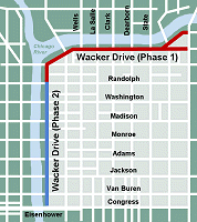 약 6만명의 보행자와 18만대의 자동차, 20개의 버스노선이 매일 Wacker 도로를 이용하고 있다. 재건축 프로젝트의 첫번째 단계는 4000 피트의 길이와 114피트의 넓이에 대한 것이다. 200백만달러의 건축비용이 소요되며, 건축은 2002년 11월까지 완성할 수 있도록 계획되어 졌다. 2004년 초부터 시작될 것으로 예상하고 있는 2번째 단계는 2900피트 길이, 134피트의 넓이로 200백만달러의 건축비용을 산정하고 있었다.