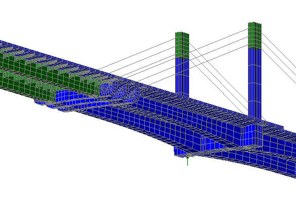 완전한 교량 구조와 접근 교량이 포함된 상세한 3D 모델이 LUSAS에서 생성되었습니다. 고체 육면체 요소는 콘크리트 데크와 교각을 모델링했습니다. 두꺼운 쉘 요소는 드롭 인 경간 및 교각 앵커 상자의 강 부재를 모델링했습니다. 강재 상자 조립체의 지역 응력을 조사하기 위해 별도의 3D 고체 요소 모델도 생성되었습니다.