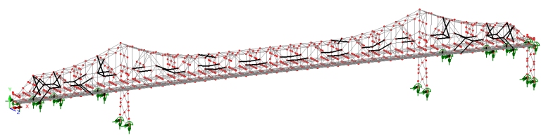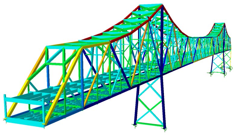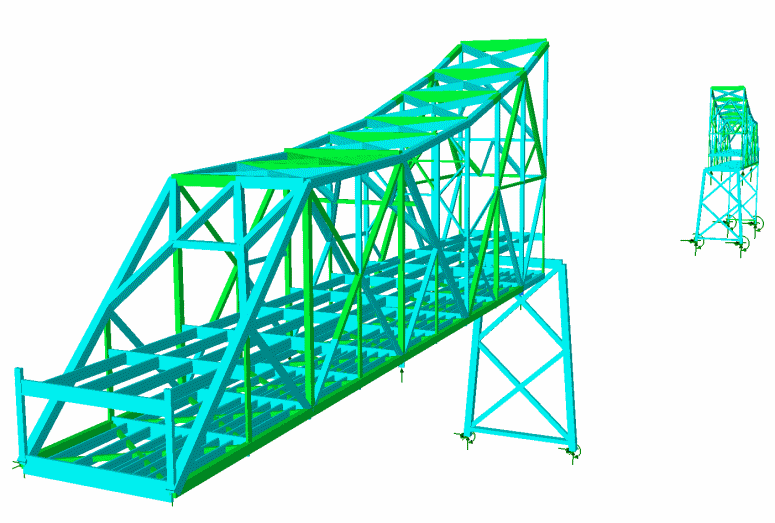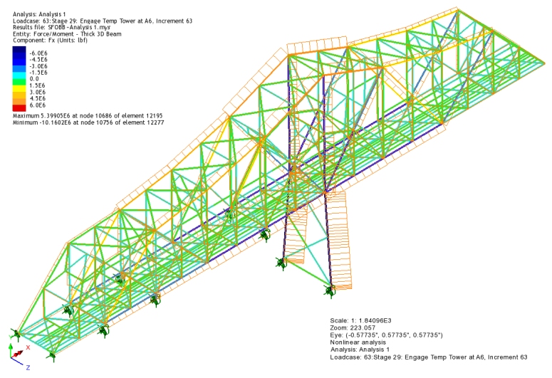 Foothills Bridge Co.는 샌프란시스코-오클랜드 베이 교량의 동쪽 주경간 전체 해체 순서를 모델링하는 데 단일 LUSAS 모델을 사용했습니다. 이 모델은 장비 및 환경 하중(사망 하중 외)과 함께 설계되고 기존 트러스 부재 하중, 임시 트러스 부재 설계 하중, 임시 타워 하중 및 임시 타워 잭킹 하중을 결정했습니다. 해체 순내내 계약자가 모니터링한 힘과 교량 이탈은 LUSAS 모델이 예측한 결과와 일치하며, 이는 교량이 예측대로 작동하고 있음을 확인시켜 주어 해체 과정에서 모두가 신뢰할 수 있도록 하였습니다.