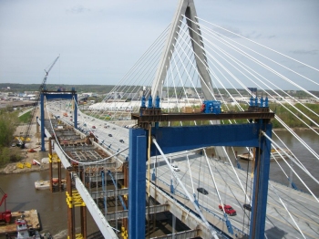 교량은 두 개의 절반이 중간으로 연장되는 방식으로 구성되었으며, 각 주요 기둥에서 700 피트(214m)씩 반대 방향으로 반걸치된 상태였습니다. 상부 코드와 하부 코드의 잭들이 교량의 위치를 조정하여 두 개의 절반이 정렬되어 연결될 수 있도록 하였습니다. 교량이 연결된 후, 서스펜디드 계획은 두 끝의 상부 코드로드를 해제함으로써 해체가 가능하게 되어 교량이 설계된 형태로 이완할 수 있었습니다. 이 해체는 576피트(176m) 길이의 서스펜디드 경간이 서로 갈라진 반대 방향의 팔에서 단순히 매달리게 되는 결과를 낳았습니다. 계약자는 원래의 엔지니어링 조립 순서를 크게 반대로 간헐적으로 제거하기로 결정했습니다. 이를 위해서 주경간은 먼저 이완된 “부풀려진” 상태에서 두 개의 독립적인 캐스터로 변환한 후, 해체하기 위해 중간 지점에서 절단해야 했습니다. 이 주경간의 절단 과정을 엔지니어들은 “컷”이라고 불렀습니다. Foothills Bridge Co.의 교량 엔지니어인 Nathan Miller는 다음과 같이 설명합니다: “이 작업을 수행하기 위해서는 서스펜디드 경간의 양 끝에서 상부 코드를 다시 연결하여 서스펜디드 경간이 캐스터의 연장선이 되고, 그런 다음 힘을 해제하여 하개선의 급속한 긴장의 줄어듦을 방지하여야 했습니다. 이 작업은 LUSAS를 사용하여 이 조립 흐름을 모델링하여 계약자가 요구되는 힘과 예측된 힘에 대한 신뢰도를 제공할 수 있었습니다.” 서스펜디드 경간의 각 끝에서 상부 코드에 가해져야 할 힘에서 약 2,000,000 파운드(8900kN)의 힘이 가해지면 약 5″(125mm)의 이탈이 발생합니다. 또한 하부 코드에도 각 트러스에 250,000 파운드(1100kN)의 힘으로 소량의 긴장이 해소되었습니다. 교량 잭킹은 LUSAS에서 잭킹 힘을 적용하고 관련 교량 부재를 활성화하여 이 힘(및 변위를 유지)하는 형식으로 모델링되었습니다. 상부 코드 잭킹 동안 관찰된 교량 이탈은 LUSAS 모델의 예측과 상당히 부합하여 계약자에게 “컷” 작업 수행에 대한 높은 신뢰도를 제공했습니다.