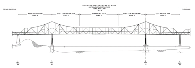 오래된 동쪽 주경간은 강철 캐스터 트러스 교량으로, 플레이트 및 압연 부재로 구성된 조립식 트러스 및 브레이싱 부재로 이루어져 있었습니다. 코드와 더 큰 대각선부재는 상자 모양으로 제작되었고 사방에 단단한 플레이트가 적용되었습니다. 더 가벼운 부재는 라이싱 앵글 및/또는 바를 사용하여 격자 구조로 되어 있습니다. 주경간은 약 2,416‘(736m) 길이로, 두 개의 주요 교량 기둥 사이에 1,400‘(428m)의 클리어 스팬을 가지고 있었습니다. 교량은 두 개의 데크로 구성되어 있으며, 원래 구성에서는 상부 데크가 양방향 자동차 교통을 가져갔고 하부 데크는 기차와 화물 트래픽을 수용했습니다. 1960년대에는 기차 트래픽을 교량에서 제거하기 위해 교량 데크가 개조되었습니다. 개조 후 상부 데크는 모든 서부 방향 교통(샌프란시스코 방향), 하부 데크는 모든 동부 방향 교통(오클랜드 방향)을 수용했습니다. 또한 1989년 로마 프리에타 지진 이후 피해를 복구하고 미래의 내진 성능을 개선하기 위해 추가 개조가 실시되었습니다. 지진 이후 수년이 지나면서 모든 현대 내진 설계 요구 사항을 준수하기 위해 교량을 개조하는 것이 비용적으로 비경제적일 것이라는 결론이 내려졌고, 이는 새로운 교량을 건설하고 기존 동쪽 경간을 해체하는 결정에 기여했습니다.