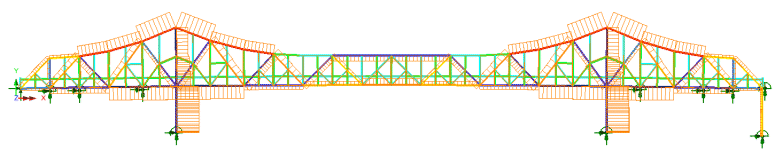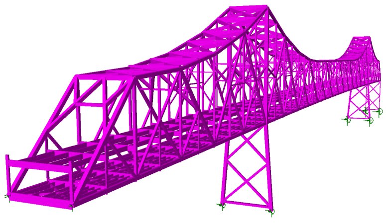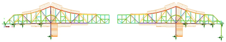 두 개의 교량 절반이 분리된 후, 해체 공정 과정에서는 여러 단계를 준수해야 하였습니다. LUSAS에서 정의된 여러 하중 사례를 정의하여 다양한 장비 배치 및 트러스 부재의 제거(모델에서 비활성화) 및 임시 트러스 부재 및 지지 구조물을 설치(모델에서 활성화)를 고려하였습니다. LUSAS에서 수행된 모델링 공정은 엔지니어들이 주요 하중 경로 부재를 제거해야 하는 주요 해체 단계와 임시 부재가 설치되어야 하는 시기를 식별하는 데 도움을 주었습니다. 여러 해체 단계에서 주요 트러스 부재가 상당한 잔여 긴장을 포함하여 제거되었습니다. 기존 부재와 새로운 임시 부재 간에 갑작스럽고 통제되지 않는 힘의 이동을 방지하기 위해 지역 긴장 해방 장치가 사용되었으며, 이는 LUSAS 모델을 통해 설계된 힘과 변위를 기반으로 하였습니다.