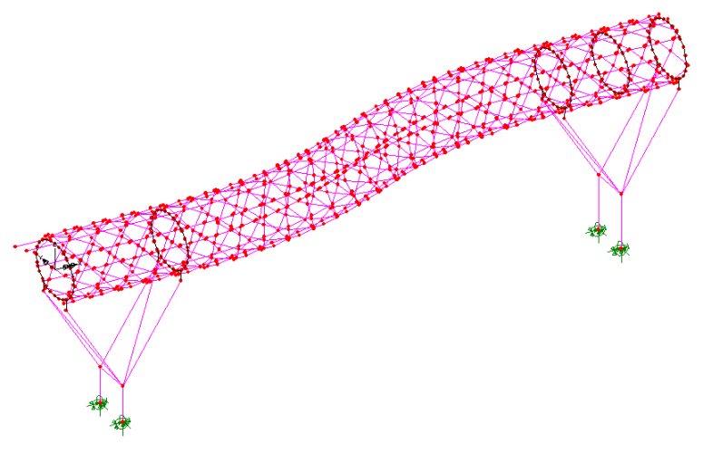 제안된 구조물에 대한 정적 해석 결과, 경량 교량의 기초부재에 대한 응력이 과도하게 나타났으며, 최종 구조에 대한 수정이나 보강이 필요했습니다. Buro Happold의 구조 엔지니어 이바 트리프코비치(Iva Trifkovich)는 “이 헬리컬 구조물은 상부와 하부 힘의 전달 역할을 하는데 전반적으로 매우 강성이 있었지만 지지대 주위에서는 국부적인 문제가 있었습니다. 우리는 다양한 보강 전략을 고려했는데, 강철 판재 보강 옵션이 수정 문제를 해결하지 못했습니다.” 최종적으로는 각 지지대 위치에 193.7 x 20 원형 강관(부재) 다이어프램 링이 사용됐습니다. 이후 해석 결과, 이러한 링의 삽입으로 교량의 지지대 주변에 있는 헬릭스의 응력이 수용 가능한 수준으로 낮아졌습니다. 이바 트리프코비치는 “구조의 복잡한 특성과 그 S자형 형태로 인해, LUSAS가 없었다면 헬리컬 부재에서의 정확한 응력과 힘을 확신할 수 없었을 것입니다.”라고 말했습니다.
