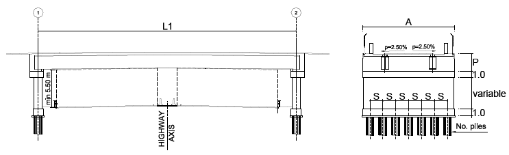 교량의 주요 구성은 1600mm 깊이의 두 개의 longitudinal 강재 보가 13.5m 너비의 복합재 콘크리트 데크를 지지하는 것으로 이루어져 있습니다. 여덟 개의 균등 간격으로 배치된 횡방향 강재 I형 보가 주요 보에 대한 하단의 측면 저항을 제공합니다. 양 끝에서 longitudinal 보가 기초벽에 삽입되며, 이 기초벽은 1.2m 두께의 기초벽 위에 위치한 말뚝 기초 위에 놓입니다. 전체 시스템은 모든 하중을 흡수하도록 설계된 단일 프레임 시스템을 형성합니다.