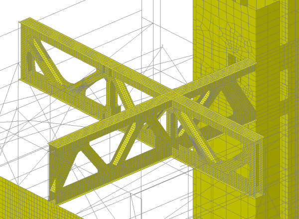 Expedition Engineering은 또한 특정 구조 부재 모델을 제작하여 국소적인 영향을 조사했습니다. 여기에는 주요 강당 위의 거대한 전이 트러스 모델링이 포함됩니다. LUSAS를 사용해 좌굴 하중 계수를 획득하기 위한 오일러 좌굴 해석이 수행되었습니다.
