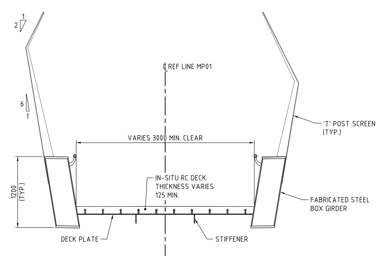 전체 교량 길이는 약 217m로, 이 중 170m가 고가 구조로 이루어져 있으며, 각 끝단에는 30m 및 17m의 접근 경사로가 있습니다. 고가 구조는 여섯 개의 연속 경간으로 구성되어 있습니다. 윈드롭 애비뉴를 오버하는 두 개의 주요 경간은 약 38m 길이이며, 나머지 접근 경간의 최대 경간 길이는 약 29m입니다. 정렬은 8개의 뚜렷한 수평 곡선과 윈드롭 애비뉴에 대한 수직 곡선을 포함하고 있습니다. 상부 구조는 1200mm 깊이에 400mm 폭의 제작된 강철 박스 거더로 구성된 통거더 디자인으로 되어 있습니다. 박스 거더는 250mm 깊이의 RHS 크로스 빔과 강화를 위한 강판으로 보강되어 있습니다. 125mm 두께의 콘크리트 데크는 강화된 강판 및 박스 거더와 함께 복합적으로 작용합니다. 데크는 고유의 포트 베어링 위에서 지지됩니다. 통거더 디자인이 선택된 이유는 마감 표면 아래의 상부 구조 깊이를 줄여 전체 교량 길이와 킹스 파크 내의 청소 및 교란량을 줄였기 때문입니다.